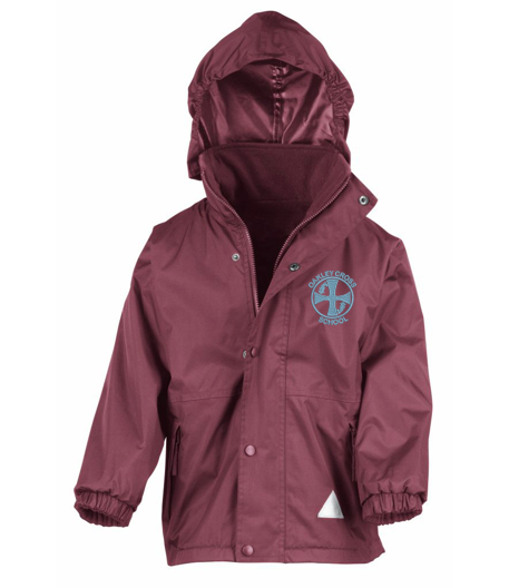 Left Breast Embroidered Logo Waterproof / Windproof Inner Fleece Concealed adjustable hood Elasticated cuffs Reflective triangle Full length zip with studded storm flap